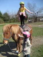 Wir lernen kleine Zirkuslektionen mit und auf dem Pferd.